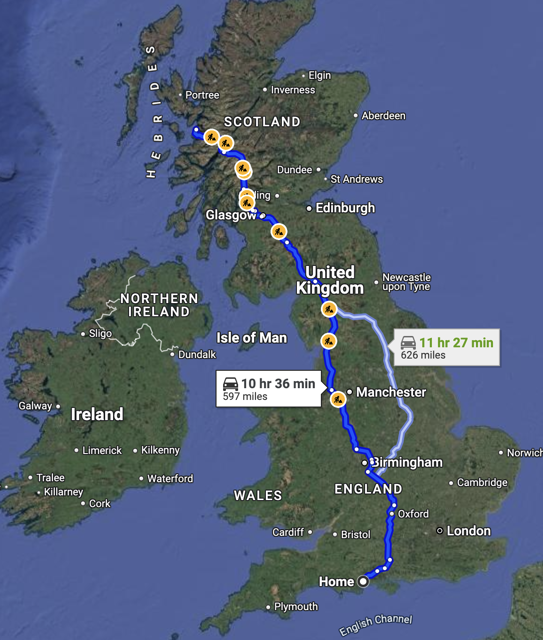 Eventually woke around 7 having had about 4 hours’ sleep (T less than that) and made a plan. We need to get home, but the initial idea was to drive straight from Glasgow to home. Which would be a big ask on any day, let alone after 3 hours’ sleep for T and me feeling like death warmed up. It’d be about 8 hours by the numbers, with stops figured in you’re talking more like 10-11. Just not doable and not safe.